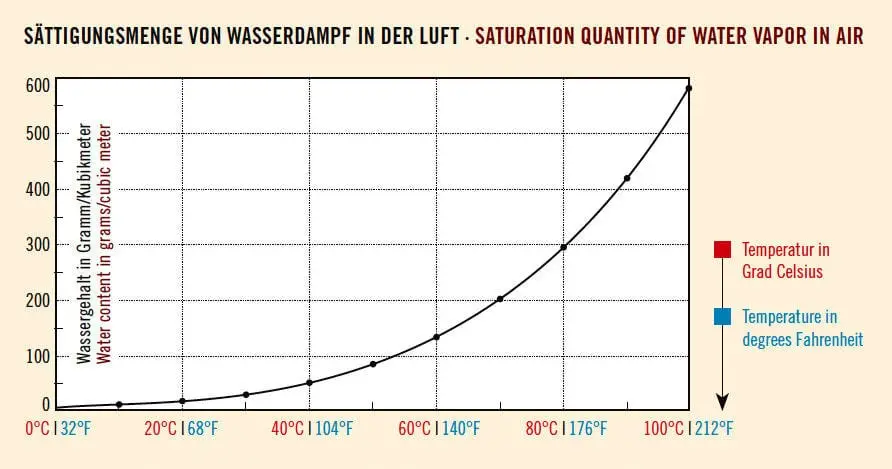 A cubic meter of air can absorb a certain amount of water in its gaseous state (water vapor). At 68 degrees Fahrenheit (20 °C), this maximum amount is 0.61 oz. water. Add any more moisture, and the air becomes saturated with water, bringing relative humidity to 100 percent. What’s more, this water is now no longer suspended as vapor; instead, it forms visible condensation on walls or other surfaces.