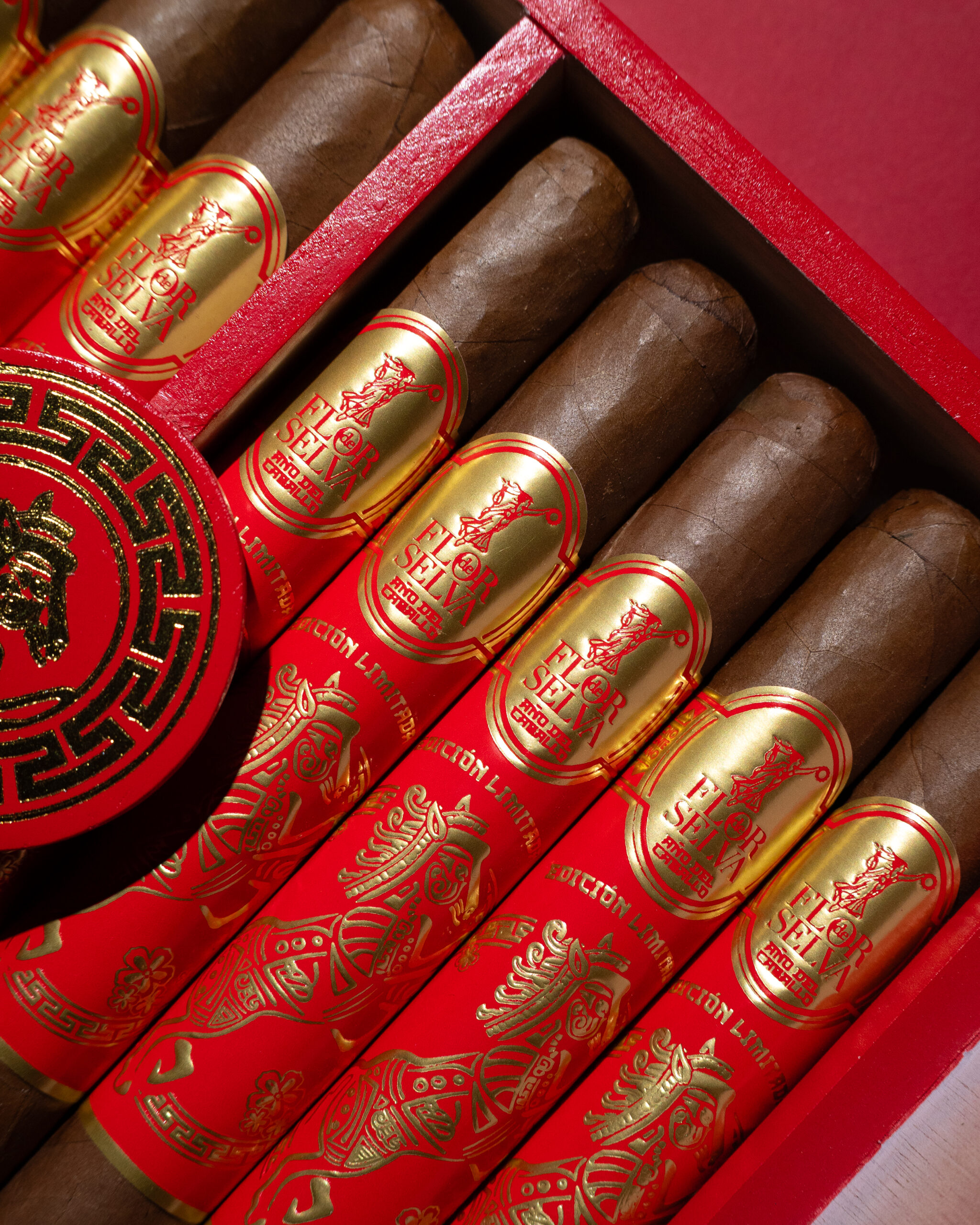 The cigar band in red and gold reflects the traditional colours of the Chinese New Year, combined with Maya Selva’s distinctive visual language. In both cultures, animals play a central spiritual role as symbols of character, protection, and one’s path in life.