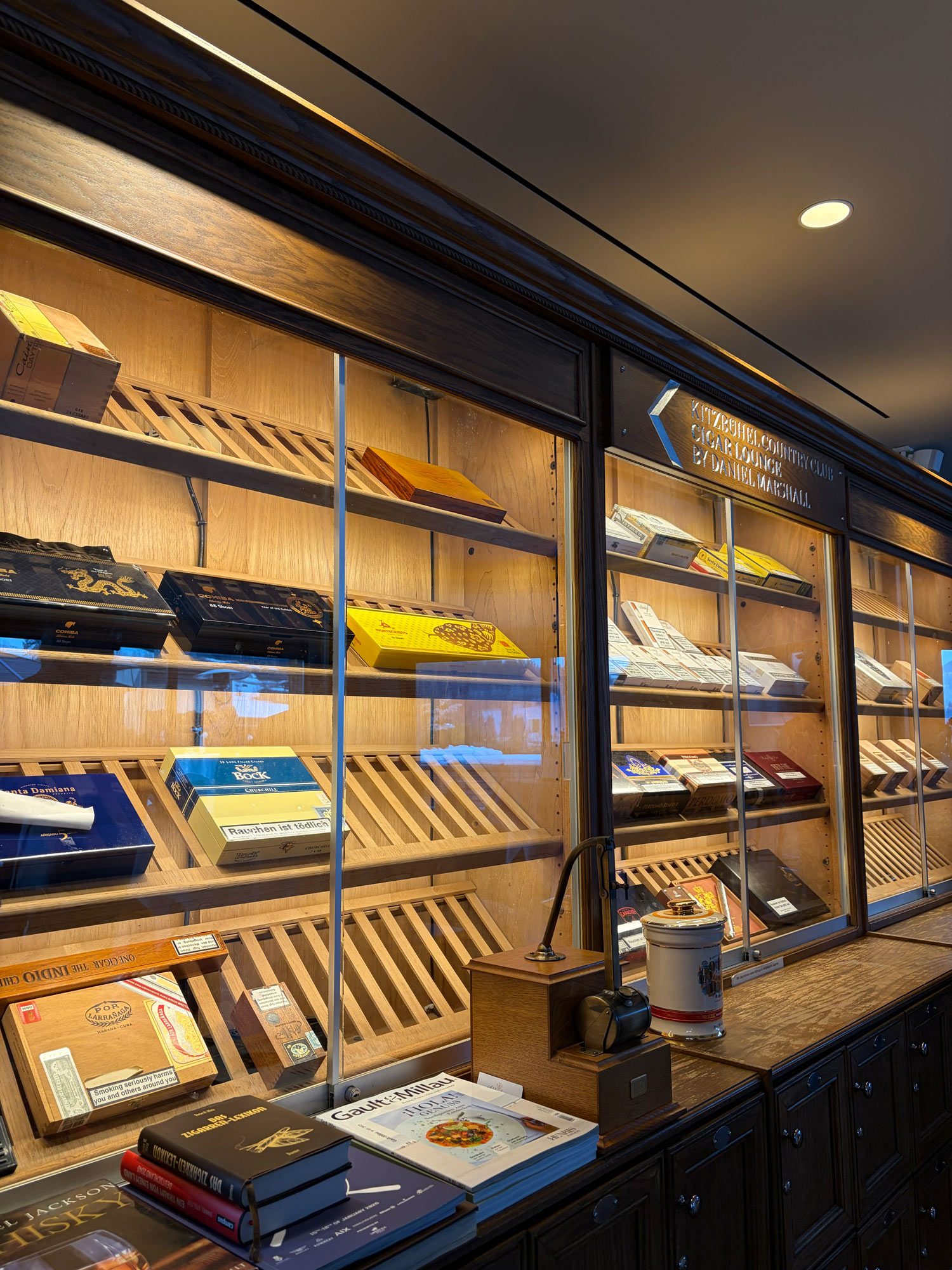 The cigar lounge itself was impeccably appointed, featuring a beautifully curated Daniel Marshall humidor and offering both an elegant indoor area and an expansive panoramic terrace. Thanks to numerous outdoor heaters, guests were able to comfortably enjoy cigars outdoors despite the alpine temperatures, turning the terrace into a cozy yet elegant winter cigar haven.